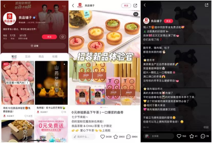 打开良品铺子的主页,他们所发布的笔记类型可以简单分为三种类型:宠粉福利、美食制作教程、明星及影视剧同款。