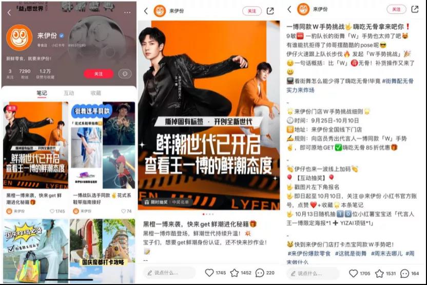 来伊份发布的笔记中,大多数是围绕代言人及其参加的综艺活动,来做话题互动。例如"这就是街舞"节目,王一博同款W手势挑战,利用这一活动,引流到线下门店,吸引粉丝到门店去参与打卡挑战。只要与代言人相关的话题和活动,都能吸引粉丝的关注和互动。