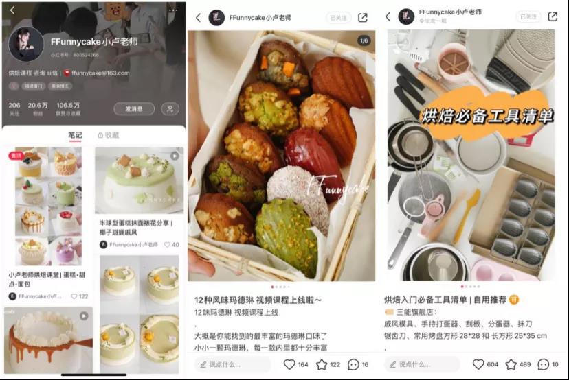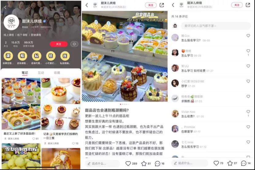甜沫儿烘焙这个账号,粉丝15,8万,获赞与收藏99.9万,在营销上是做得比较出色的。从他们发布的笔记看,内容主要是烘焙新品制作、烘焙相关营销思路/方法、学员培训、门店加盟及经营情况这几大类,主要是引流到线上线下课程,定位比较清晰。
