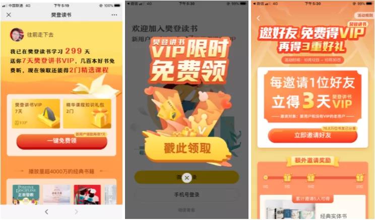 而私域裂变增长就能很好地降低获客成本。它的本质就是由老用户带来新用户,动力通常是利益驱动。看了樊登读书的用户增长方法,不难发现,它有两个优势,既节省了大量的推广费用,又起到了高效涨粉的效果。