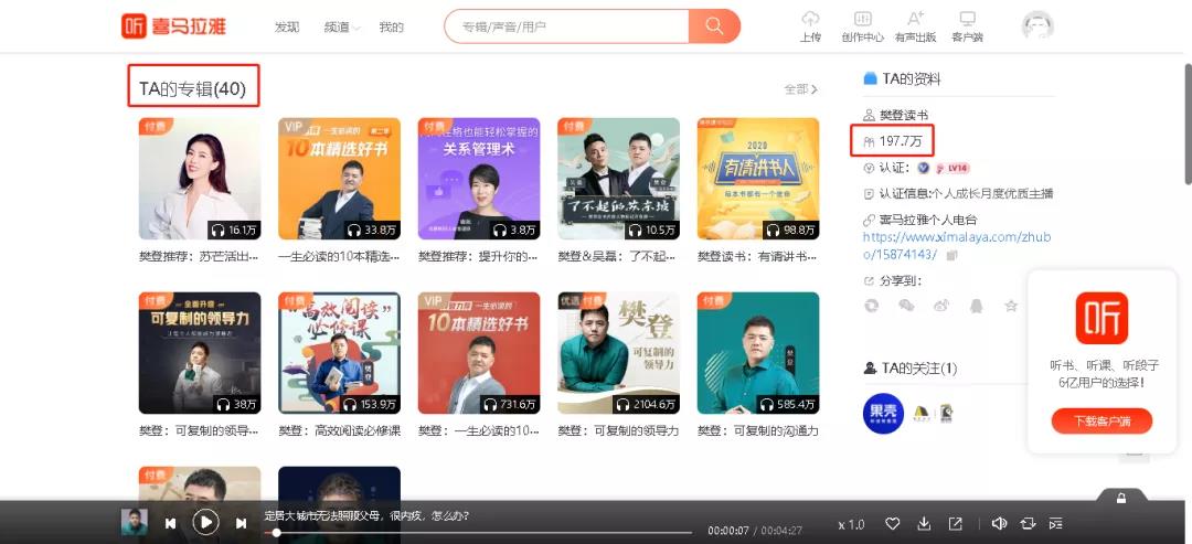 樊登老师的课程在各大平台都有合作发布。包括知识平台喜马拉雅、小鹅通和知乎,长视频平台腾讯视频、爱奇艺和优酷。