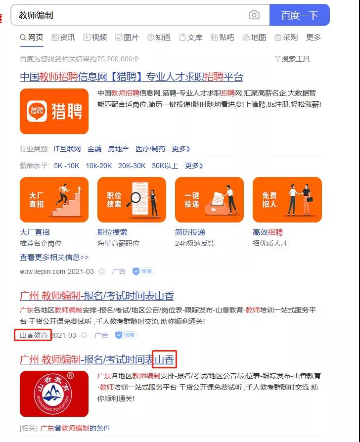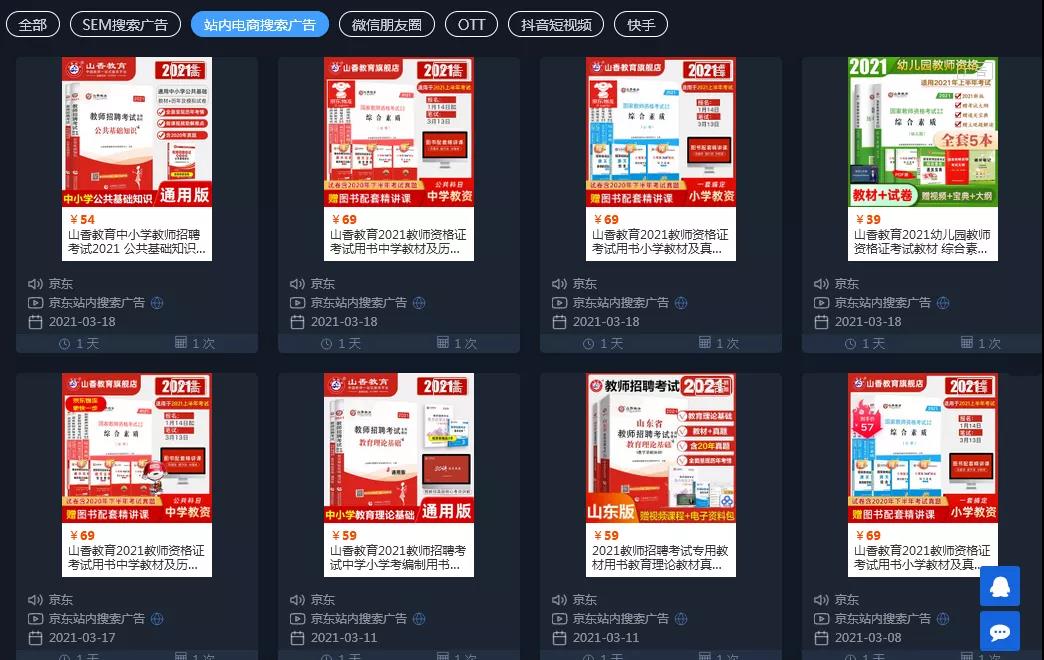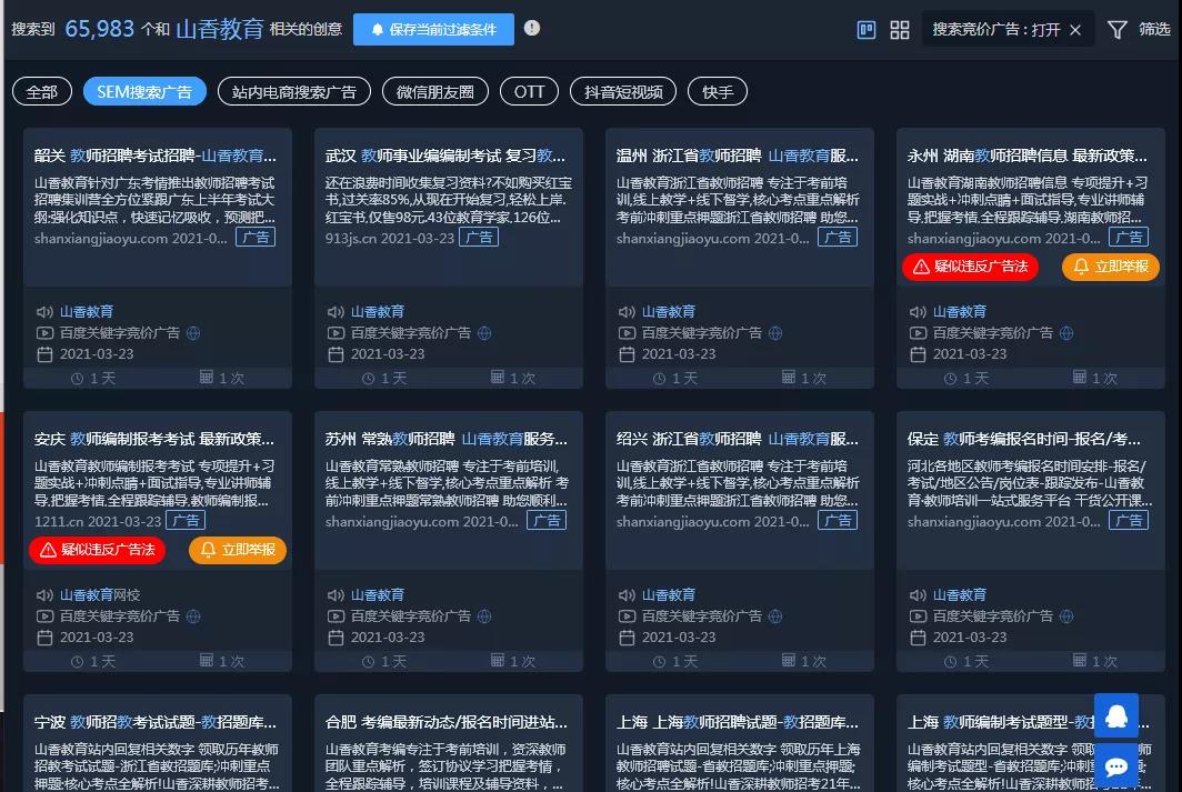 用广告查查搜索发现山香教育目前在sem和电商平台(淘宝和京东)上投放较多