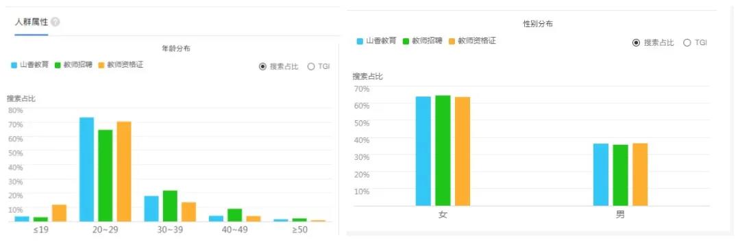 用户年龄集中在20-29岁,也与教师资格证、教师招聘的用户年龄画像保持一致。女性用户对山香教育的关注度高于男性,其中女性用户占比60%,男性用户占比40%。