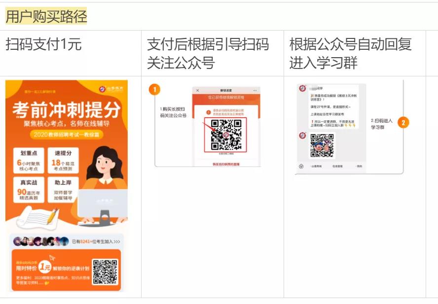 第二个,在推广和宣传环节,文案都是给用户非常愉悦的感觉,让用户抱着对课程和福利的期待完成购买,个人认为比截杀他让他害怕效果要好。