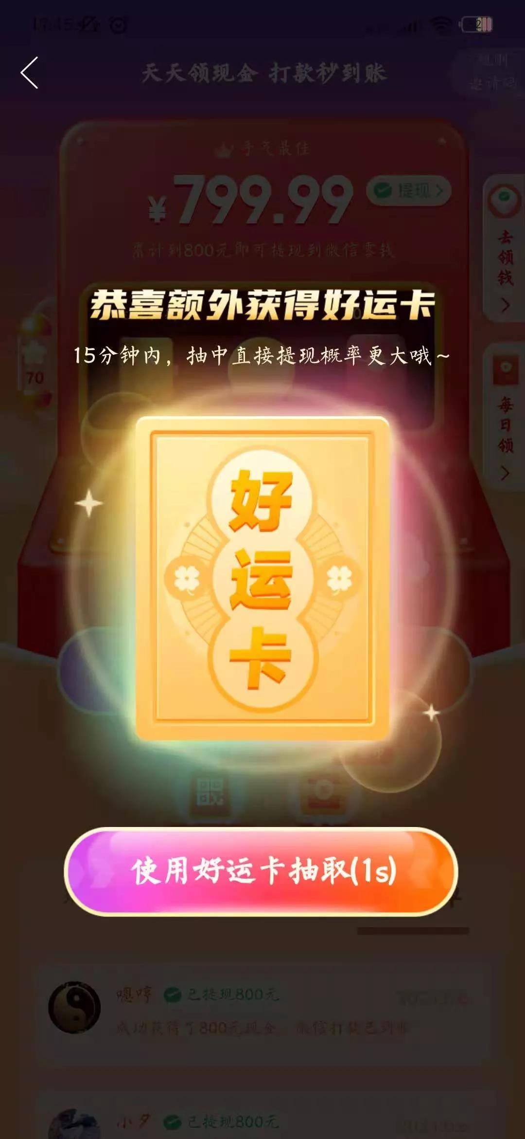 之后还会有好运卡,提示你还有几次抽奖即可获得现金等等。多次给与用户好处,让用户觉得提现的目标很容易达成,从而愿意进入到游戏中。