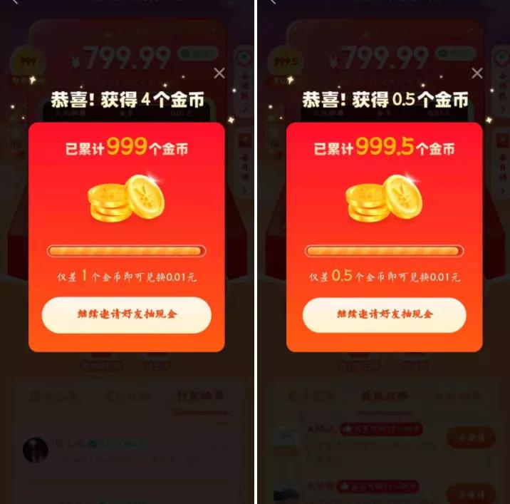 第二次抽奖之后,用户会抽到得一个接近1000个金币的数额,例如我抽到的就是995个金币,此时抽奖次数已经用完,而任务金额为799.99,系统也会提示离完成仅差5个金币,分享好友助力获取抽奖机会。