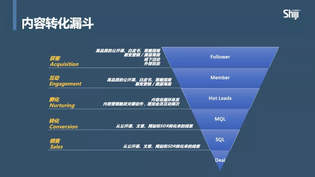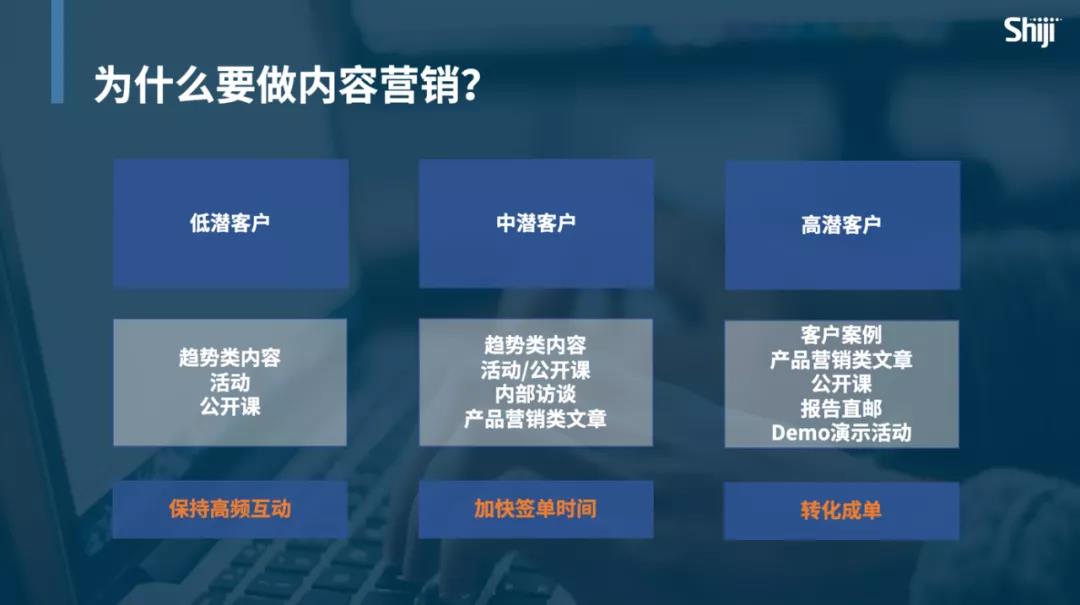 我们会很清楚的告诉销售,针对大家所关心的低潜客户、中潜客户、高潜客户,我们的内容营销策略是什么,能够帮助大家从销售层面上解决哪些问题。