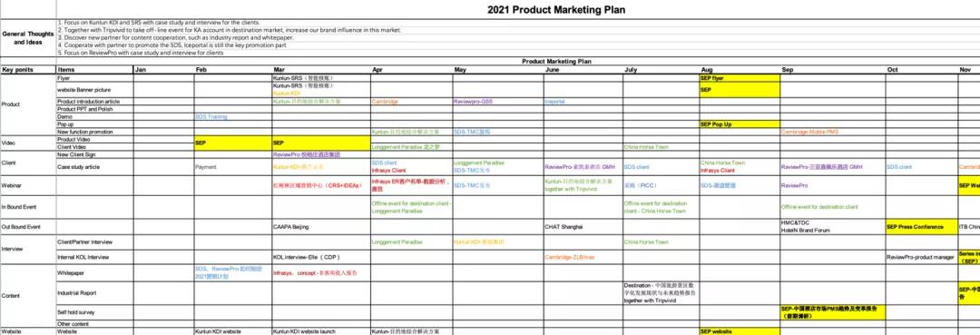 高强度的内容产出,需要有良好的规划。年初要定调。就是说,以产品线为核心,我们需要在年初就梳理出每一条产品线的整年营销计划。这份营销计划,基于与每条产品线老大的深入沟通,达成一致。以下是我们2021年制定的产品营销计划,便于大家理解。