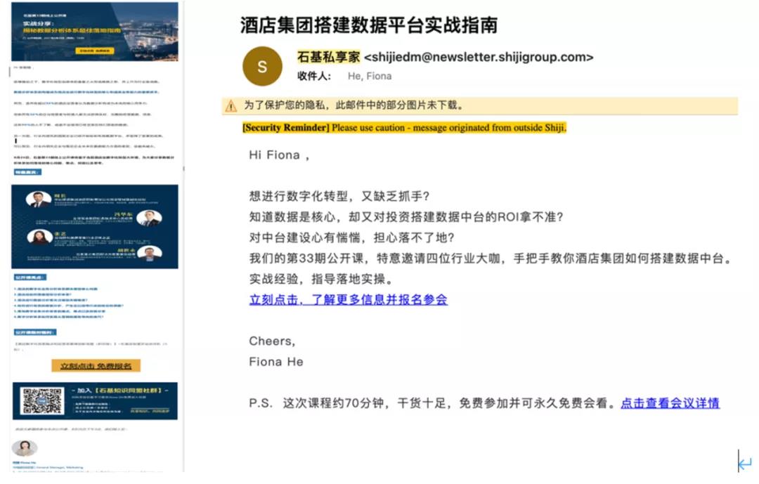 你认为以上两种EDM的形式,哪一种转化率更高?同样都是宣传公开课报名,右边的EDM比左边的点击率要高出数10个百分点。右边的EDM点击率可以高达80%以上。