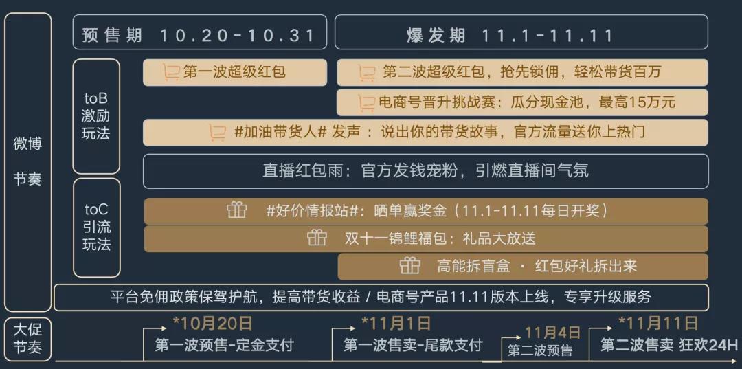 整体来看,微博电商的双11分为两个阶段,从10月20日到10月31日为种草期,以内容种草为主,配合一些简单的单品销售;11月1日至11月11日,则是营销的爆发期。
