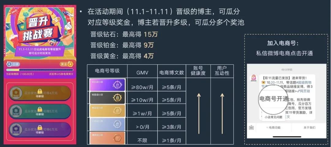第三个玩法是微博独有的"送钱"玩法——电商号的升级挑战赛。从11月1日开始,微博电商会进行百万的现金补贴,店主通过完成自身账号的升级,可以进入不同的奖金补贴池,领取到平台提供的福利,如果能从"青铜"连续晋级到"钻石",可以赢得最高15万的奖金。