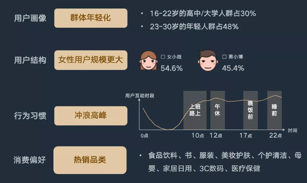 微博的用户很年轻,90后和00后的用户占比接近80%,女性用户的规模略高于男性用户,这两项数据直接指向了多兴趣关注和生活消费,用户的消费时段也有明显的规律。