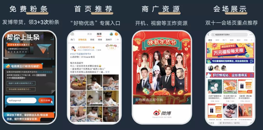 双11微博电商会汇集站内最强的流量来帮助店家扩大曝光,粉丝头条、开屏广告等方式也能帮助店家承接公域流量。