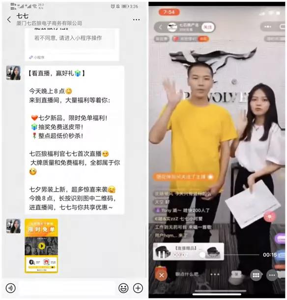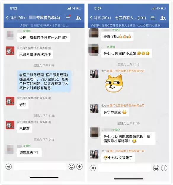 因为在之前引流过程并不需要做过多人工操作,因此运营人员能够将时间和精力更多的花在客户维护上。由于七匹狼所属的服饰类大多是非标品,因此只会在大促、冲业绩等极少场景下 使用单聊群发这种重打扰方式,而主要通过社群运营来做客户维护。