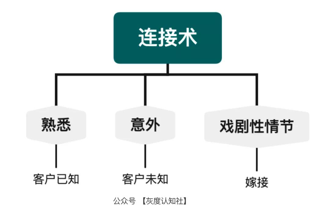 连接术=熟悉(客户已知)+意外(客户未知)+戏剧性情节(嫁接)。