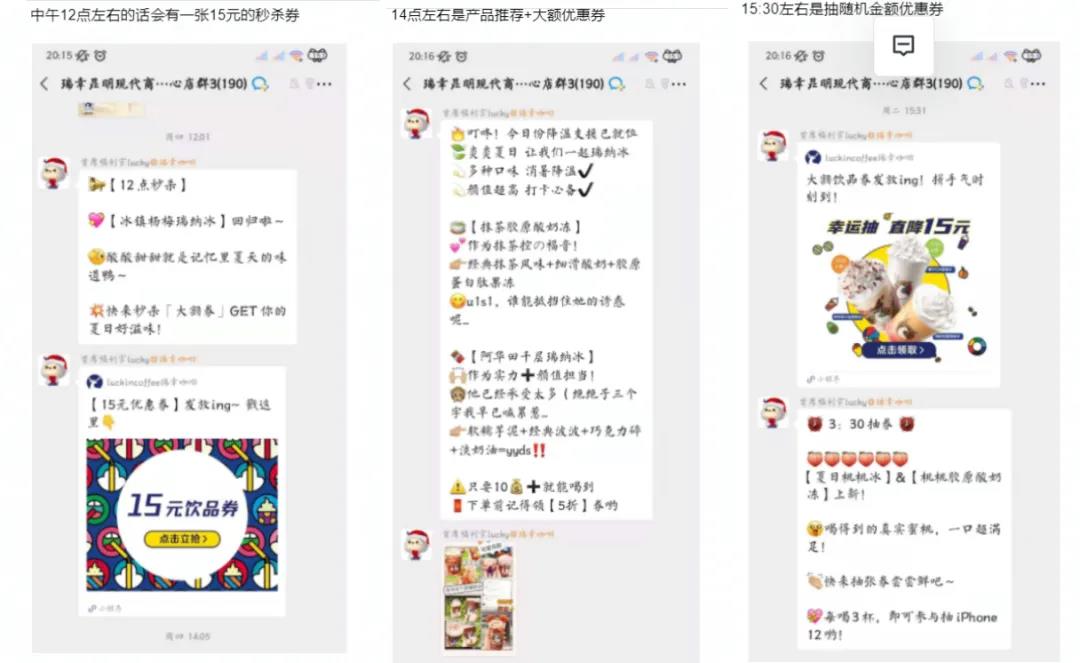 瑞幸的社群运营可以说非常有特色,因为它就只干一件事情发券。这和我们认知的社群运营很不一样,大佬带我的时候总说群内没有互动,很容易死掉的,但是瑞幸很明白的表示没有互动照样可以做得很好。
