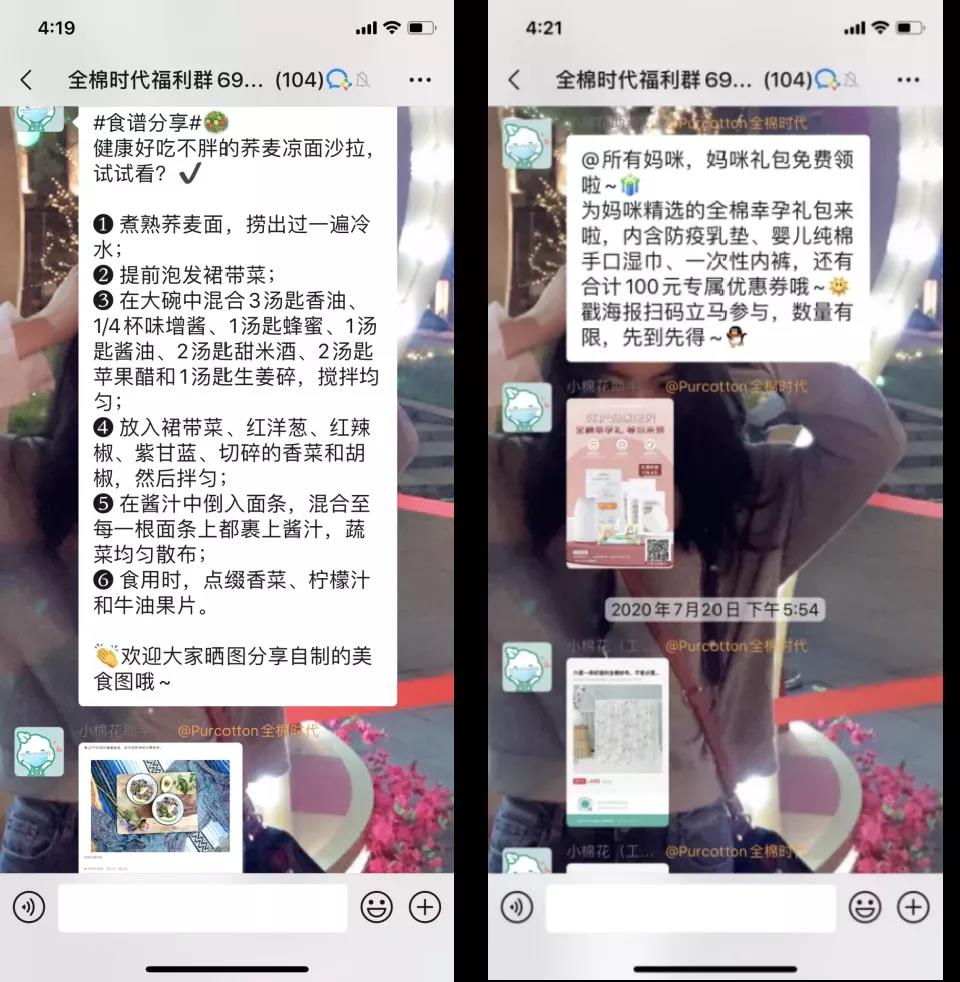 例如全棉时代的用户很多是宝妈,在育儿上有大的需求及痛点。在全棉时代的公众号中发布「带娃雷区」的内容,转发至社群中吸引用户观看,最后为产品做引流。