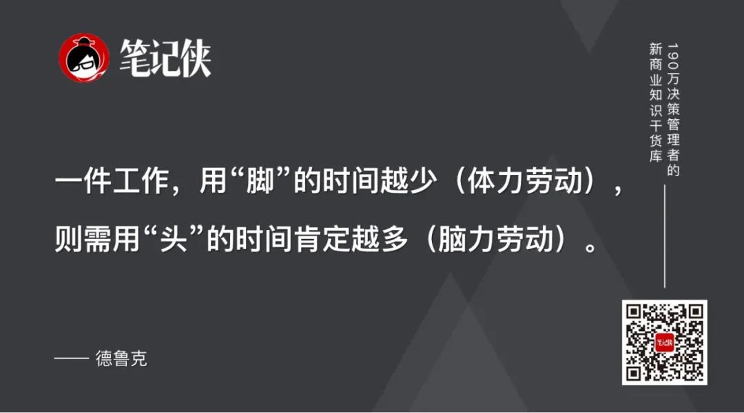 这句谚语,我们不妨把它视为"能量守恒定律"的一种颇为新奇的解释,但它也有"时间守恒定律"的意味,意思就是说:一件工作,用"脚"的时间越少(体力劳动),则需用"头"的时间肯定越多(脑力劳动)。