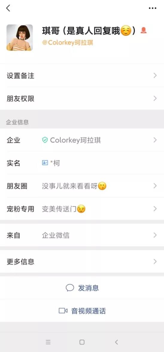 群主人设打造了个人 IP,大气洒脱的昵称琪哥,头像是酷酷、时尚的卡通女孩,与品牌用户定位潮酷女孩相贴合,个人对外名片有朋友圈和小程序链接,可以让用户加过来的第一时间了解到更多渠道内容,增加品牌信任度。