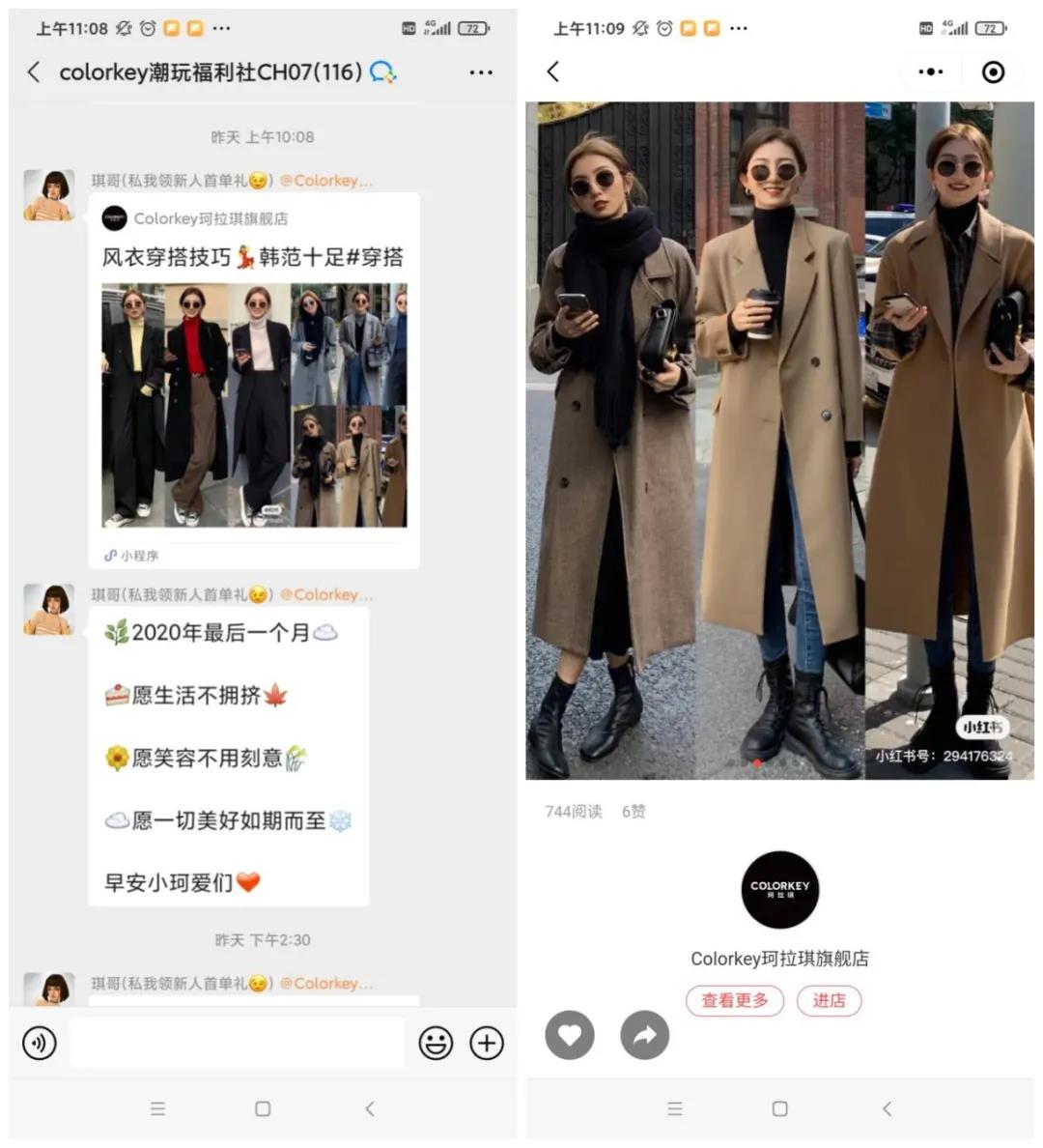 社群分享内容不局限自己产品,也会分享其他内容,比如穿搭技巧,以文案+链接形式,点击链接是详细的介绍和轮播图,通过这种链接方式分享,可以减少大量内容刷屏,我们还可以直接看到浏览量数据。