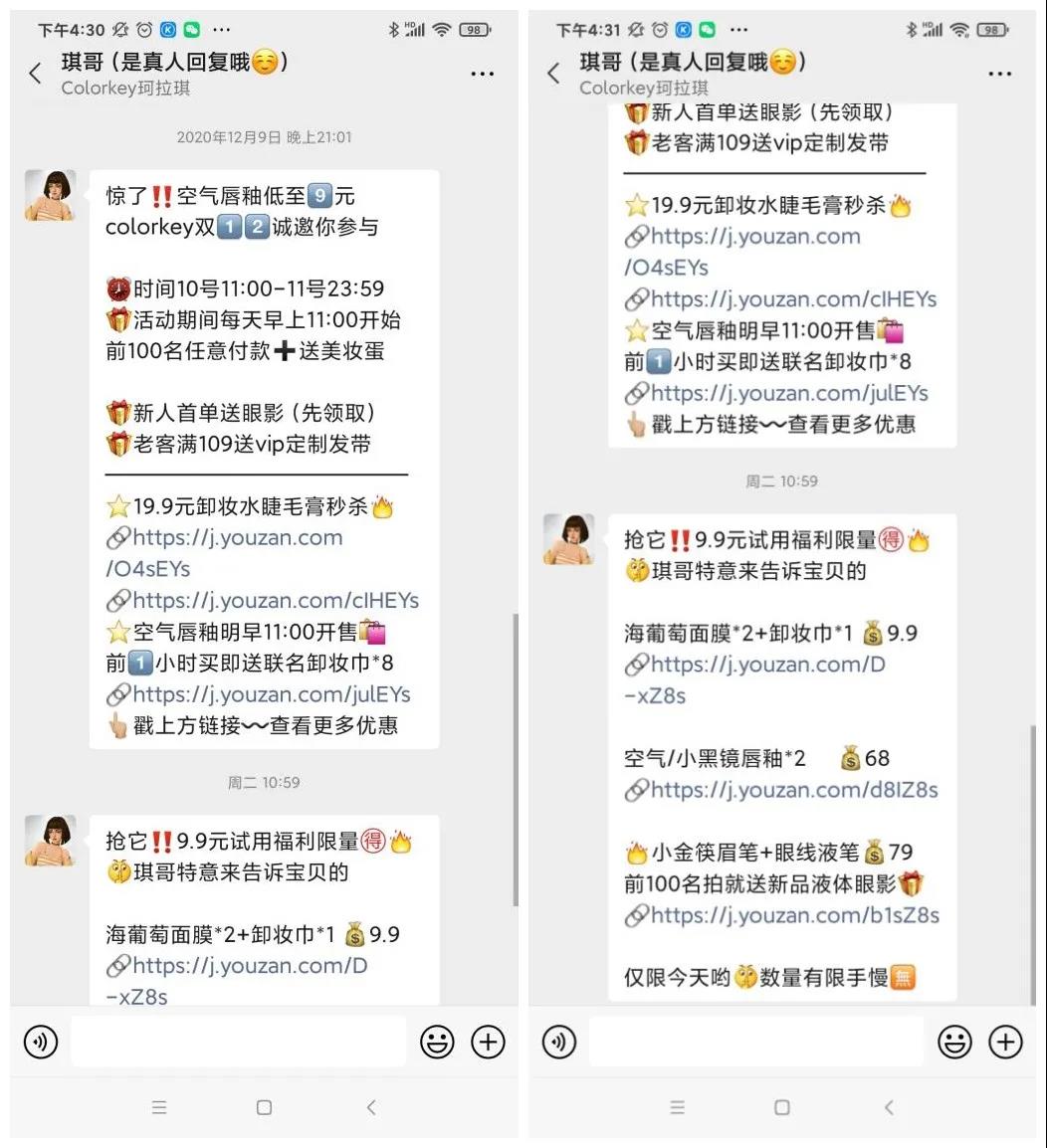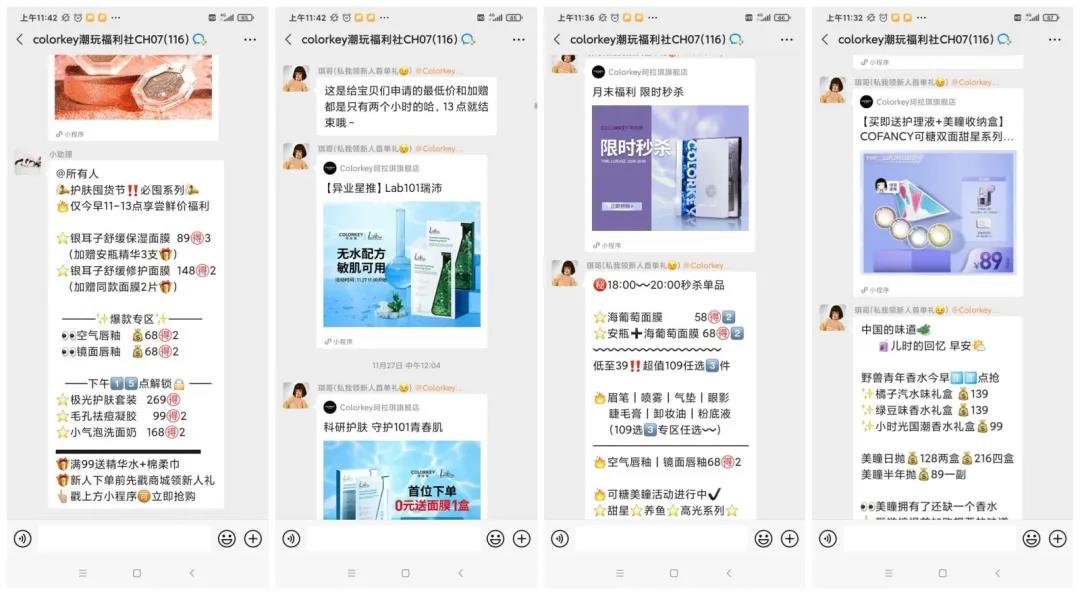 除了在社群及朋友圈的触达方式外,珂拉琪在单聊场景中也设计了相应的动作,保证相关活动的触达效果.,一般每个月会群发一次消息,内容是产品的优惠活动,单聊群发,可以更快的触达到客户,通过活动优惠,激活一些平时不太关注群消息的用户,实现转化。