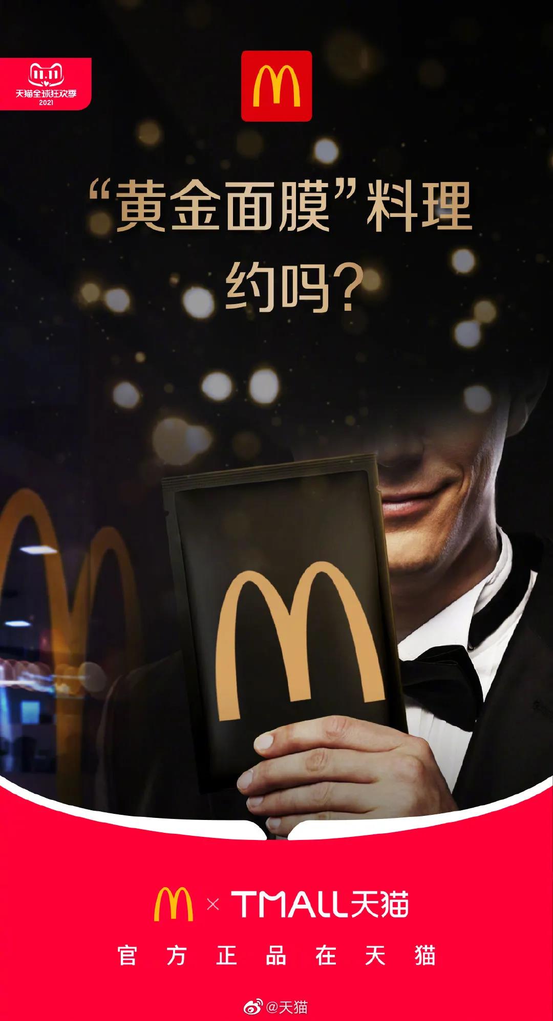 麦当劳将跨界、黑科技、美容、体育的元素融入到营销当中,基于"一场沉浸式体验+一款神秘黄金面膜+一次尊贵的黄金礼遇",不仅打造可圈可点的营销概念——"麦当劳黄金面膜料理",加深升级版产品的记忆点;更是释放功体育明星效应和直播互动价值,把新品面世的仪式感和氛围感拉满。这一系列用心的铺垫,让品牌的双十一营销,起于新品上市却高于新品上市。