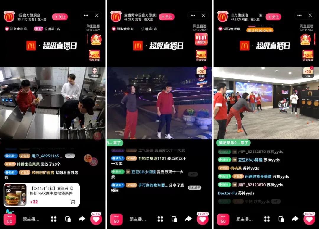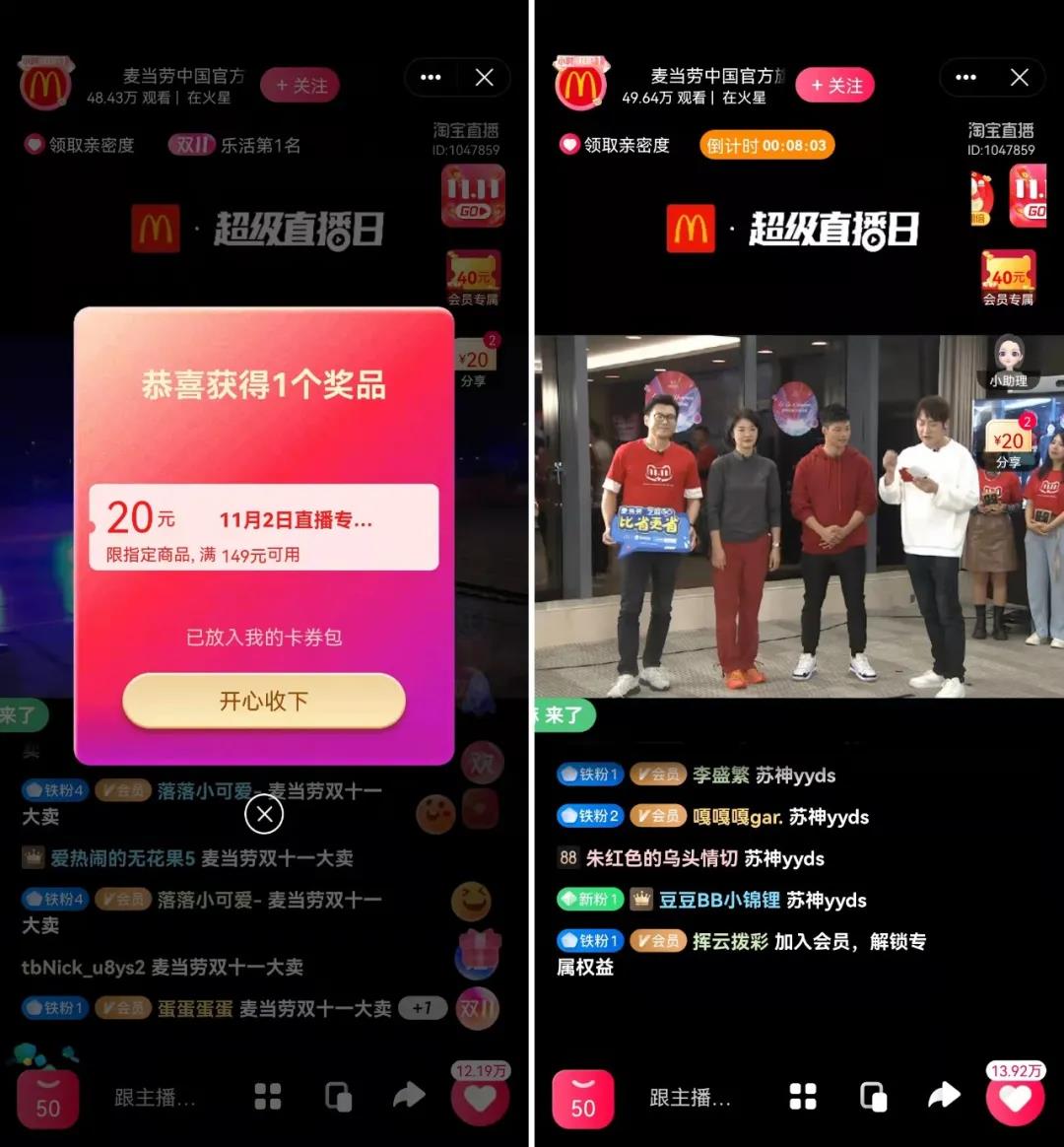 在这个过程中,麦当劳还以"麦当劳双十一大卖"、"苏神yyds"等口号,配合福利发放引导受众发弹幕互动,有效调动了直播间的氛围。