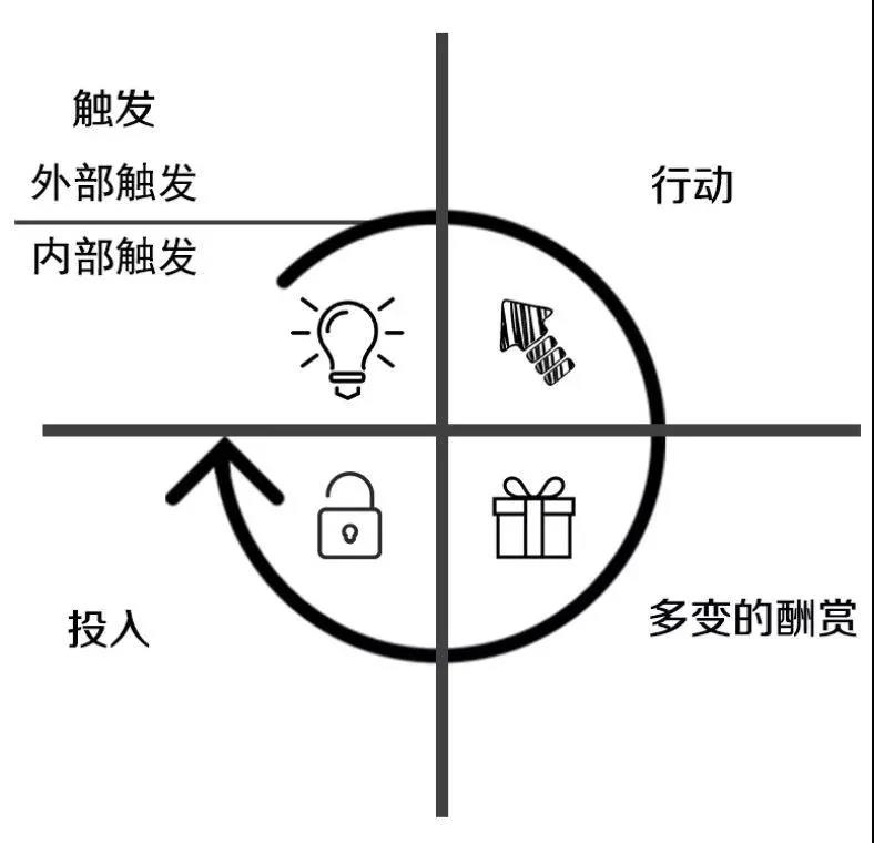 这个模型来源于美国一部研究用户习惯的理论书籍《上瘾》:一个能将自己变成用户习惯的互联网产品,必将经历四个阶段:触发、行动、酬赏、投入,一旦用户进入这个习惯循环,对产品上瘾的概率就会大大提升。