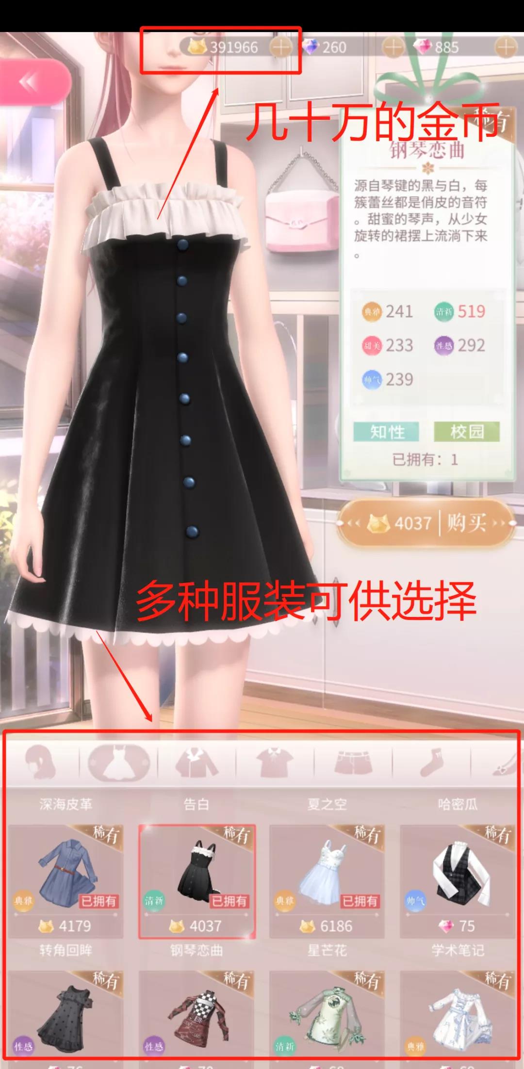 游戏设计师们设计了这近万套的衣服,并且不断推陈出新,尝试多种风格,这些才构成了大量女性用户疯狂氪金的根本。