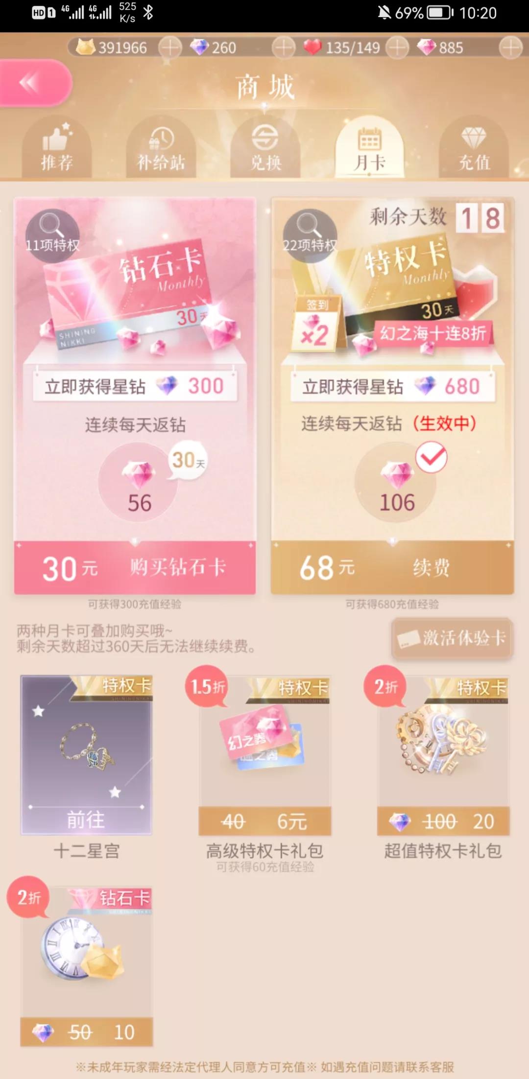 同时对于购买了钻石卡和特权卡的用户,在购买其他道具事业有相应的折扣和每日福利。
