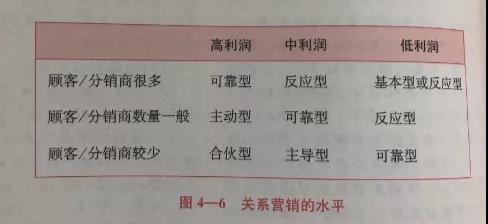 基本营销(单纯销售)、反应营销(鼓励建议和互动)、责任营销/主动营销(了解和改进)、合作营销(为客户成功服务)。