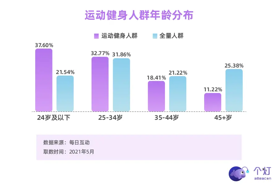 每日互动大数据显示,运动健身人群更偏年轻化,"24岁及以下"的年龄特征更明显。由此来看,运动健身人群中95后占比更高。