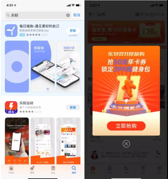 ①APP:乐刻运动,正逢双11节点,弹窗就是双11活动。