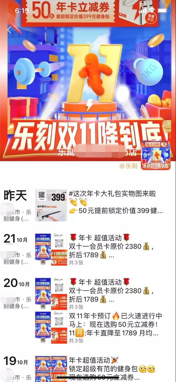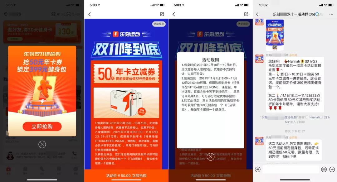活动规则:提前购买50元年卡立减券,晒单到群里,即可获得399元健身包。