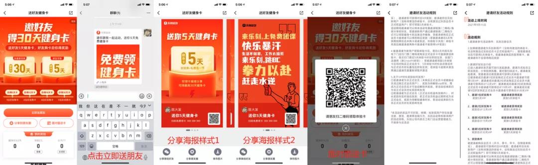 第三阶:邀请好友扫码注册并体验,邀请者要想获取更多的奖励,就会自发的督促好友完成后续动作(去线下体验→购卡),赠送对应的健身天数