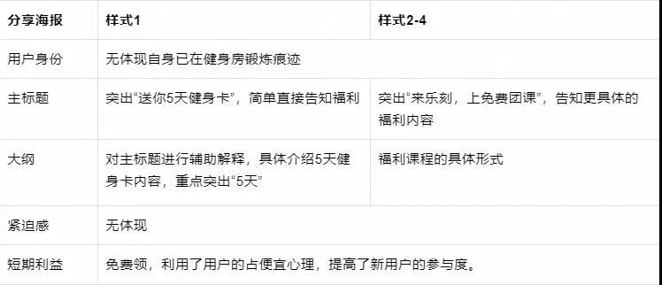 并展现了具体化场景"24小时随时练、月付制、身边的健身房",与用户目前的需求会更加紧密,更加迫切,利益点强。副标题中也对主标题做了进一步的解释,5天健身卡包含什么内容。