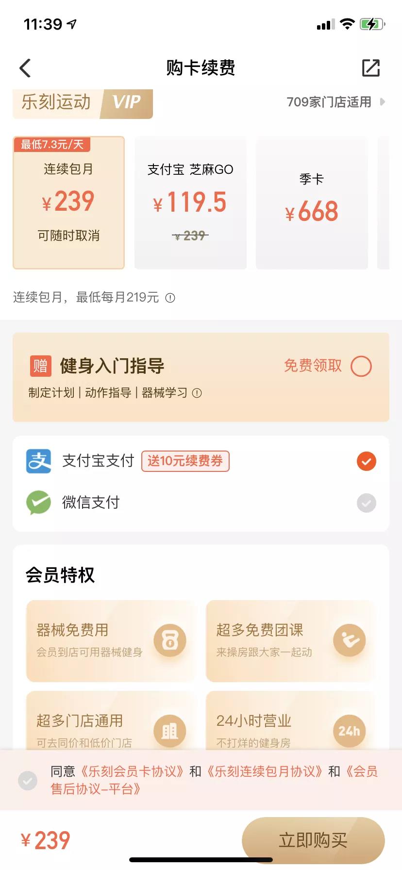 福利策略:免费使用器械、免费团课、全国门店通用、24小时营业,还有健身入门指导。还可以用芝麻GO来付款,半价即可购卡。