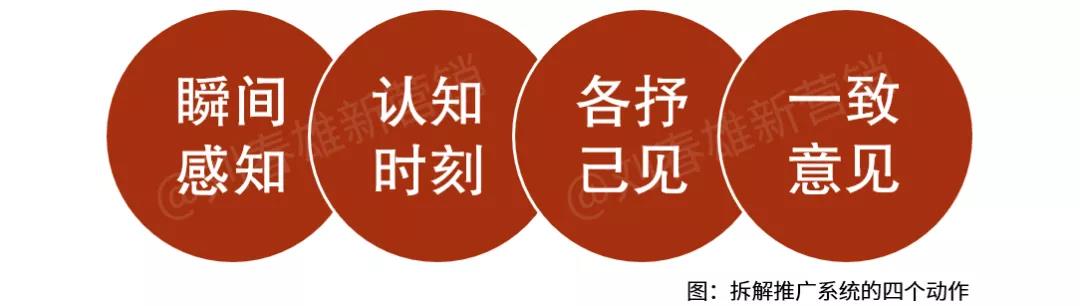 拆解推广系统的四个动作是为了构建用户的"认知飞轮",由瞬间感知 、认知时刻、各抒己见、一致意见这四个节点构成: