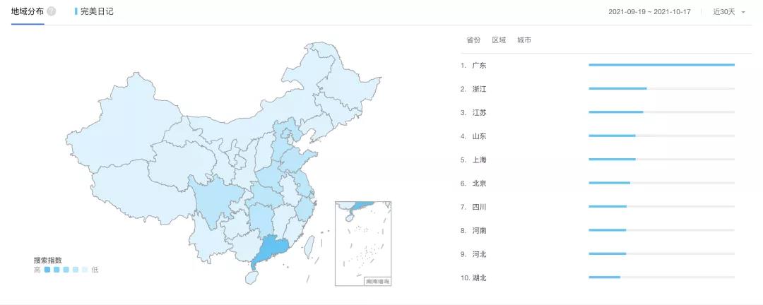 从地域分布来看,完美日记的用户更分布于广东、浙江、江苏这些城市