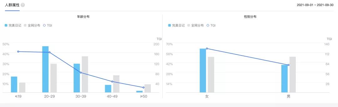 从年龄来看,完美日记的受众人群为20-29年龄的用户,同时女性占比为60%左右