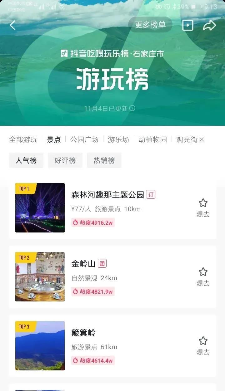 经过团队的运营推广,金岭山在抖音同城景点排行榜位于第二位。(PS:排行榜第一名为森林河趣那主题公园,也是公司运营的项目)