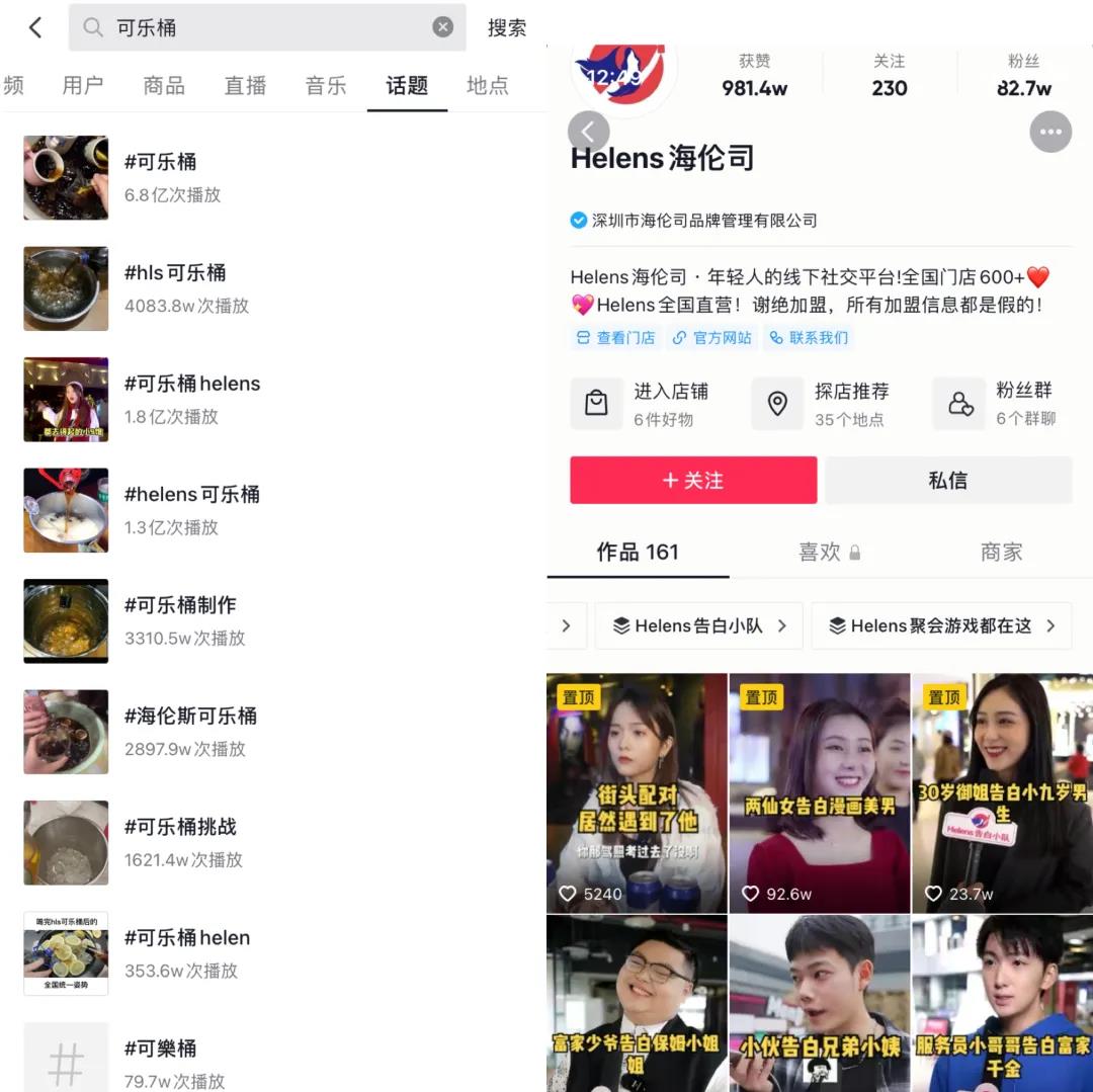 此外,海伦司抖音号上还开辟了"告白小队"、"聚会游戏"等栏目,加强与用户的互动。