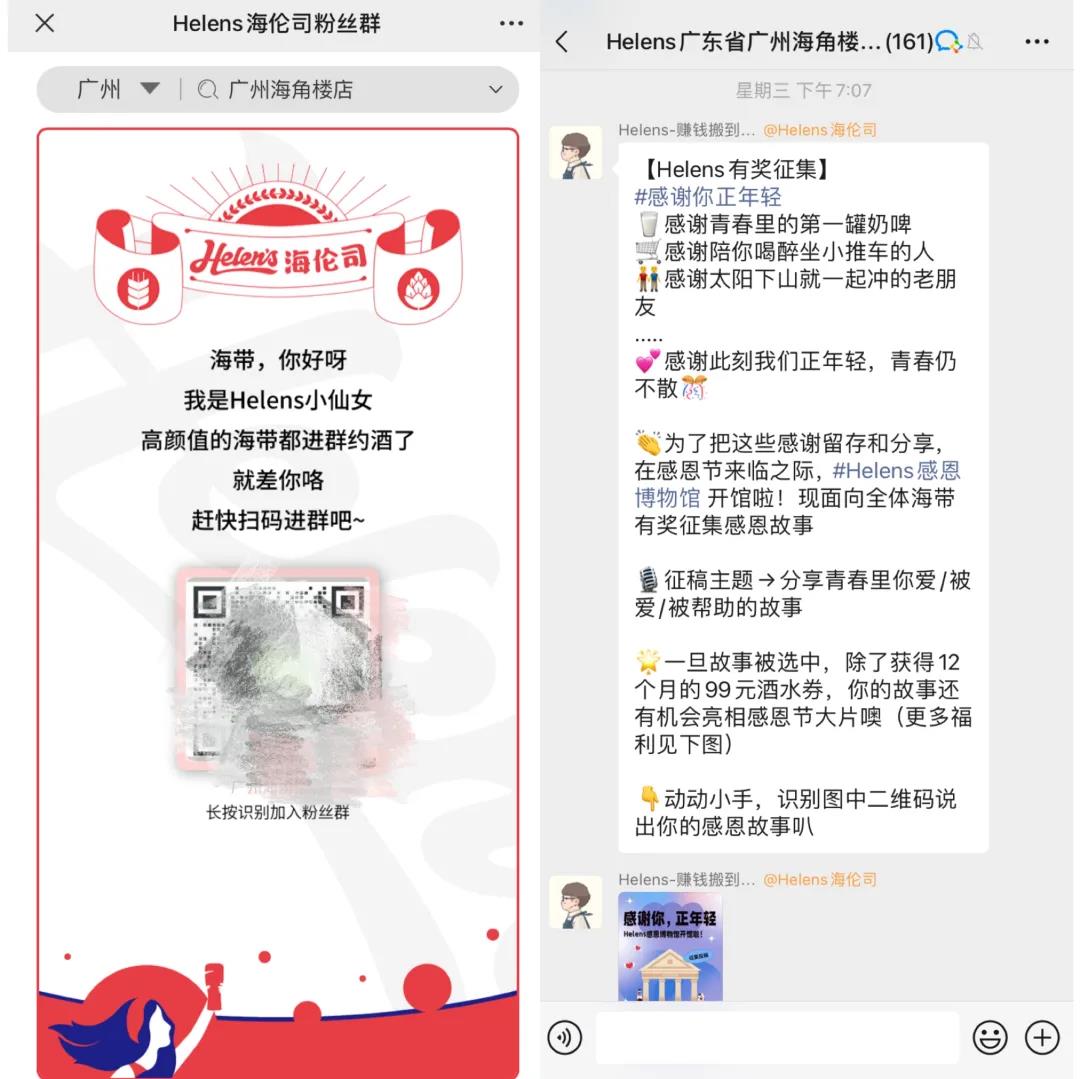 在微信公众号上,海伦司引导用户加入粉丝群,并在群内定期发布"买一送一"等福利活动,推送每日歌单,吸引顾客二次消费,巩固客群。用户也可以自行"勾搭"其他用户,组队去小酒馆。