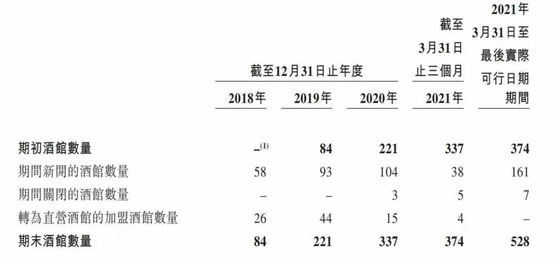 从招股书看到,海伦司的开店速度在2018年突飞猛进,截至2018年、2019年、2020年12月31日及2021年3月31日,海伦司的酒馆网络中的酒馆总数分别为162家、252家、351家及374家,并进一步增加至截至最后实际可行日期的528家。
