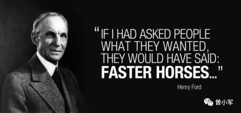 还有另外一个说法来自亨利.福特,他说,“如果我问人们需要什么,他们只会告诉你想要一匹更快的马”。