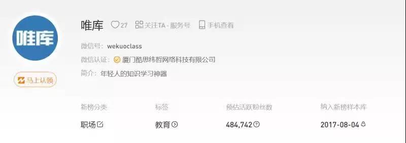 根据新榜的数据显示,唯库公众号旗下的活跃粉丝有484742