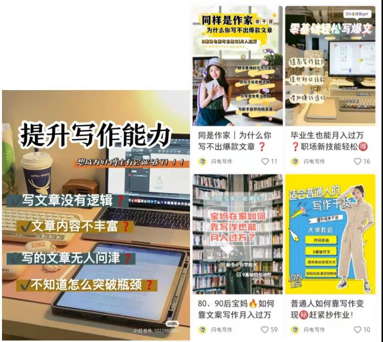 唯库的小红书直接把写作会遇到的痛点内容,或者教你轻松写作赚钱这样的内容,放到封面上。