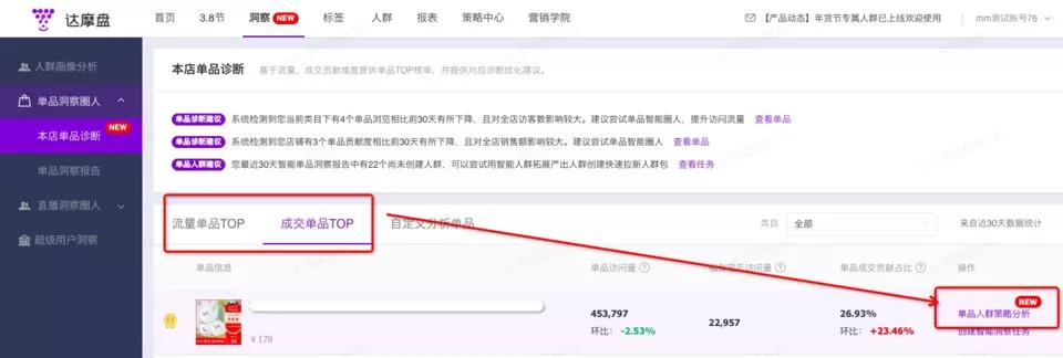 一是单品诊断:基于流量、成交视角提供店铺单品诊断和优化建议,助力商家快速定位目标单品,快速匹配营销策略。