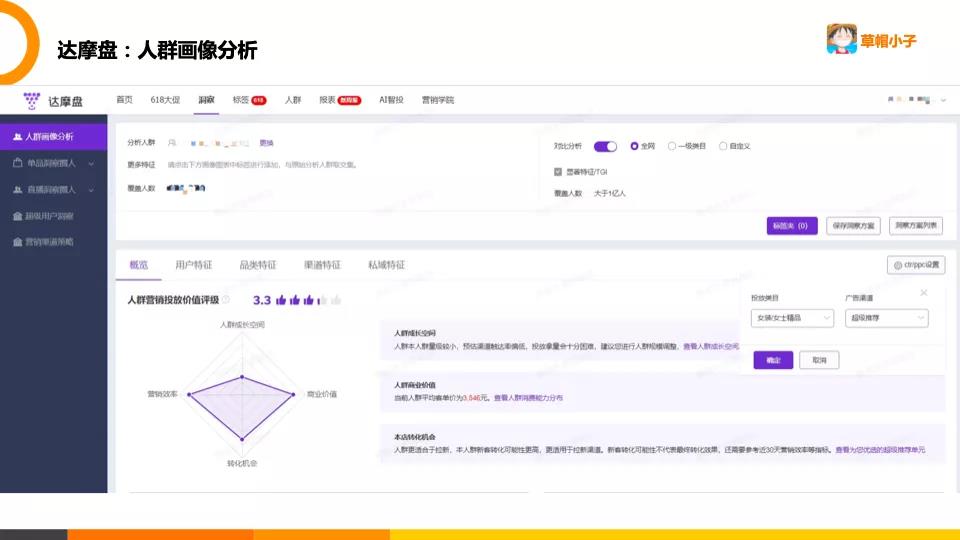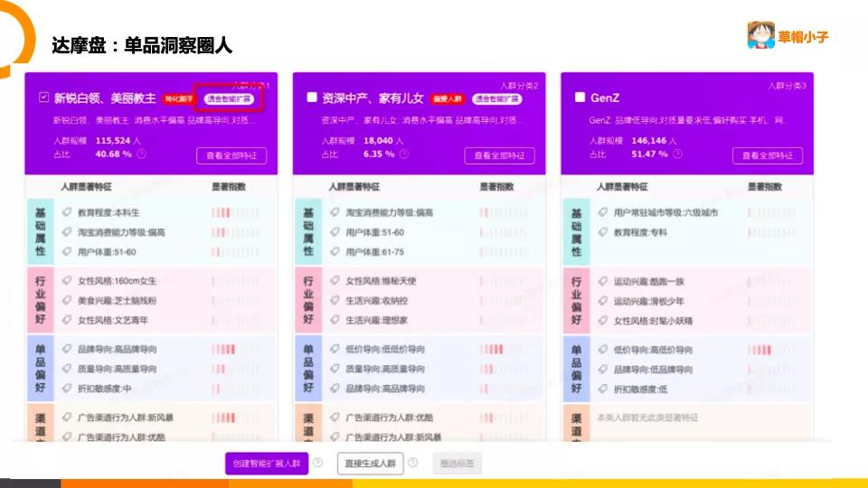 草帽小子:这个模块比较有理解难度,需要分析师进行分析、算法人员进行建模得到。最开始做人群洞察难以做到如此程度,这需要大量的分析沉淀、大量的历史数据的沉淀来进行算法模型训练。