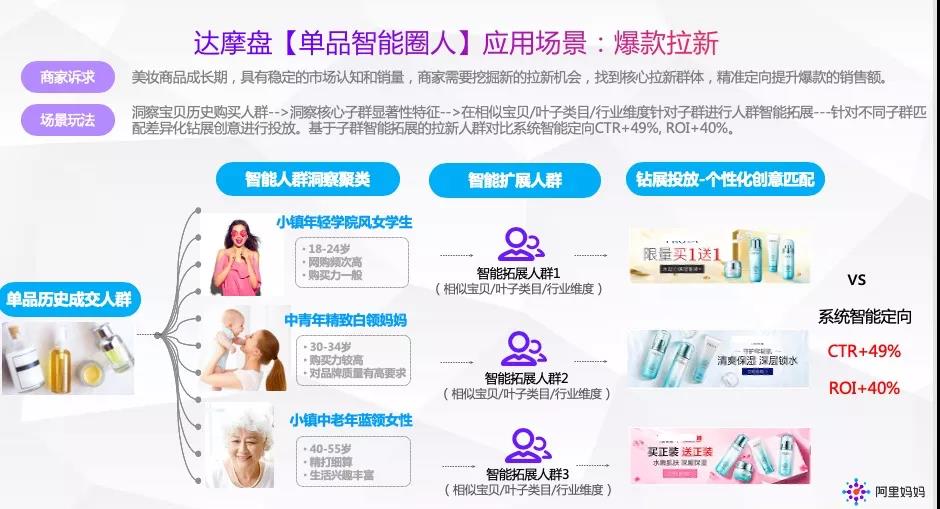 场景玩法:洞察单品历史成交人群->洞察核心子群显著性特征->在相似宝贝/叶子类目/行业维度针对子群进行人群智能拓展->针对不同的子群匹配差异化广告创意进行投放。